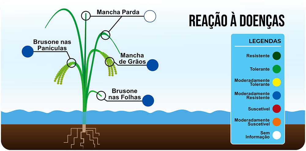 Cultivar de arroz irrigado de ciclo médio, adaptada ao sistema de produção Clearfield. Apresenta resistência ao acamamento, à brusone e à toxidez por ferro no solo, além de folhas verdes escuras e pilosas que permanecem verdes até a maturação. Possui panícula densa protegida pela forma bandeira, alto rendimento de grãos e tolerância a atrasos na colheita.
